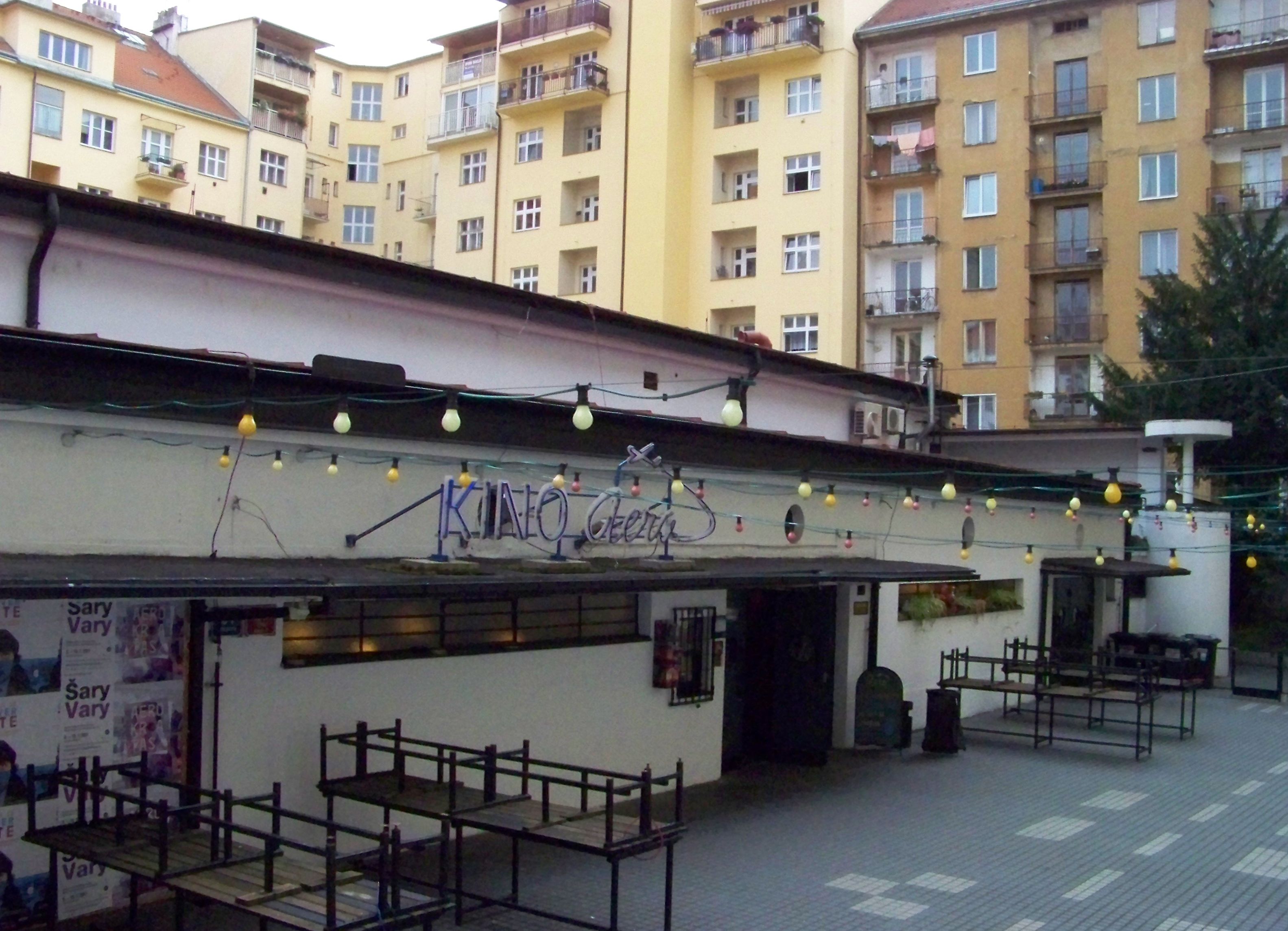 Tradiční artové kino v vnitrobloku na Žižkove. S barem a posezením venku.